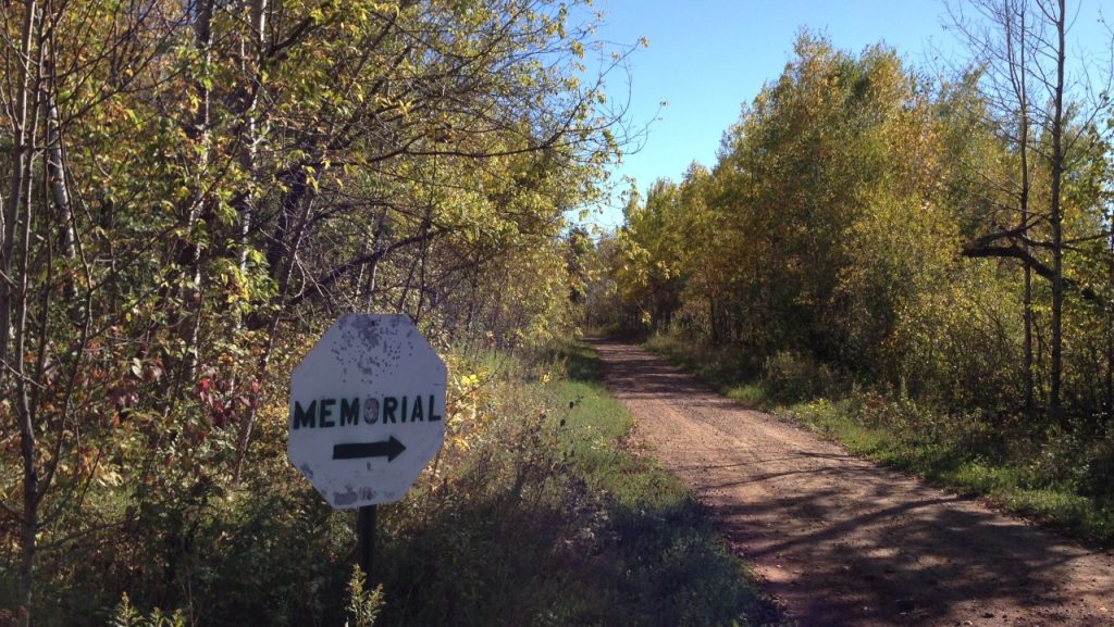 I wasn’t especially curious about that sign when I encountered it. It was taciturn, a whitewashed stop sign with MEMORIAL and an arrow hazily stenciled onto it in black spray paint. It beckoned passers-by to the right; I continued left without giving it much thought. I was there to hike to a scenic overlook during a lull between presentations at the local community college, not to pay tribute to some unspecified possibly memorable thing.